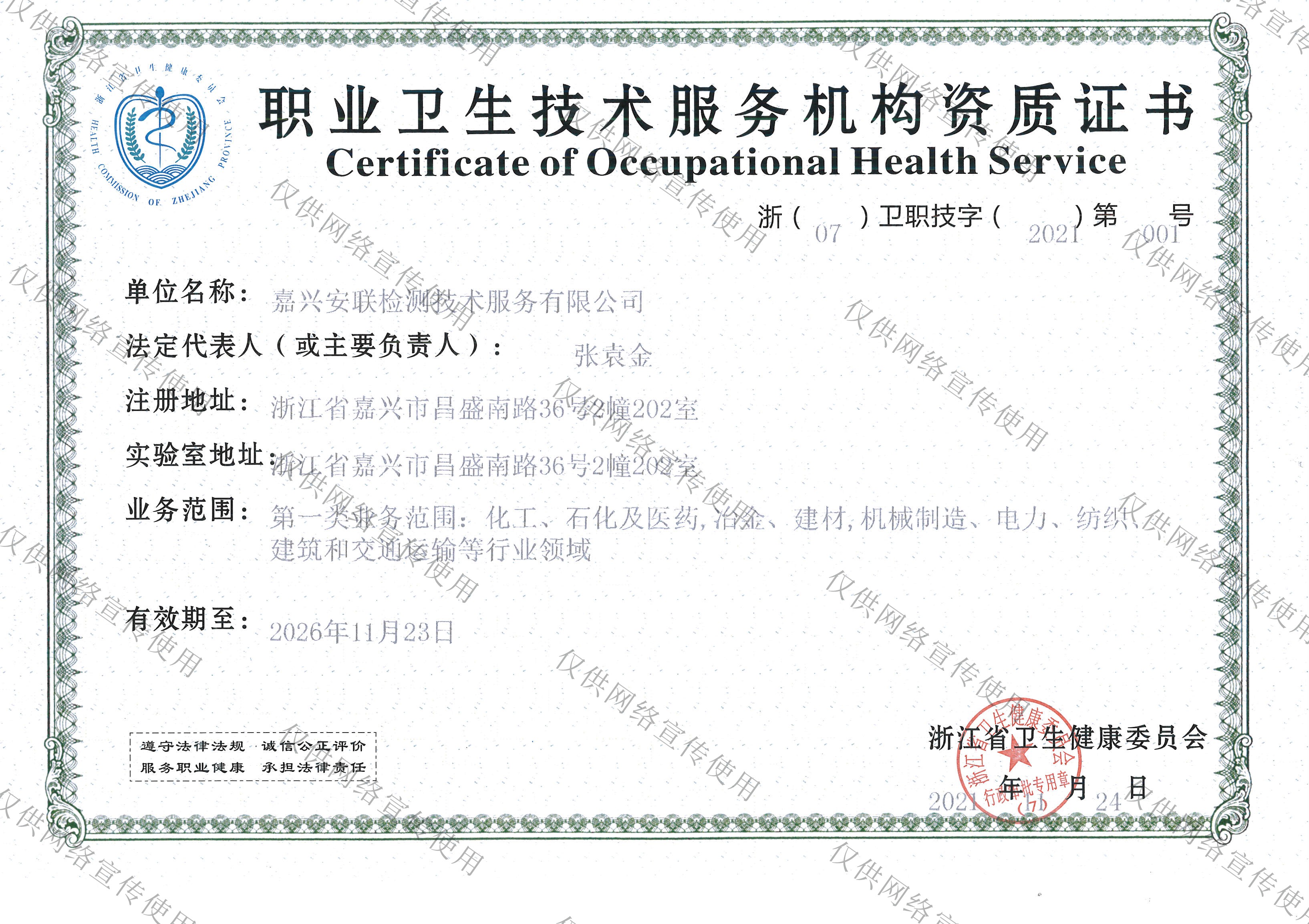 喜訊:嘉興安聯(lián)順利取得《職業(yè)衛(wèi)生技術(shù)服務(wù)機構(gòu)資質(zhì)證書》!